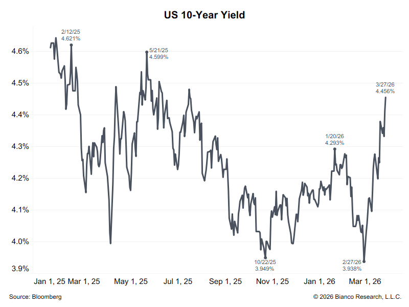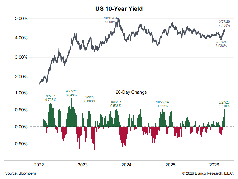 Today is the 20th trading day since the war began. As the bottom panel shows, the 10-year yield is up 51 bps.