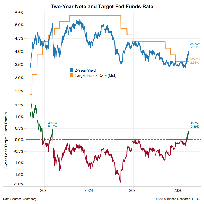 Consistent with the fed fund futures pricing above is the 2-year note. As this chart shows, it just topped 4% (blue) and is trading at 39 bps above the target funds rate (bottom panel).