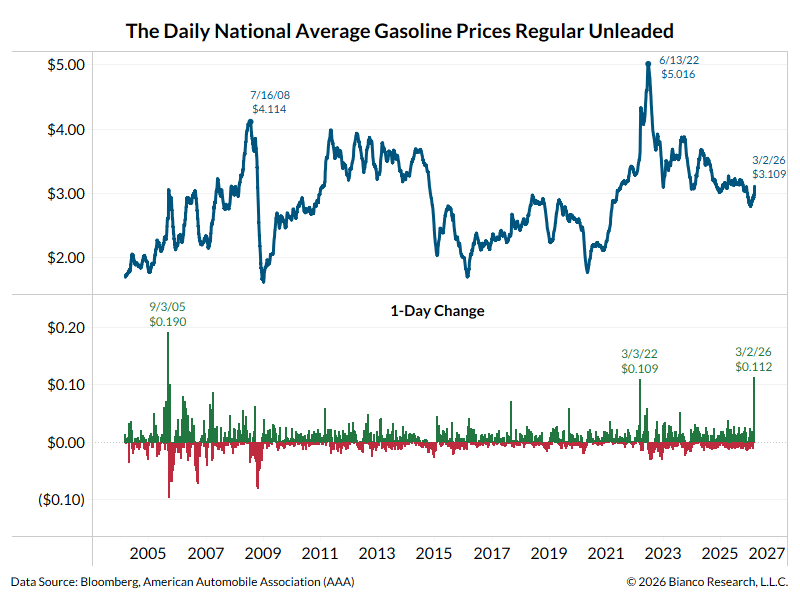 Yesterday, the national average gasoline price jumped 11.2 cents (bottom panel).
