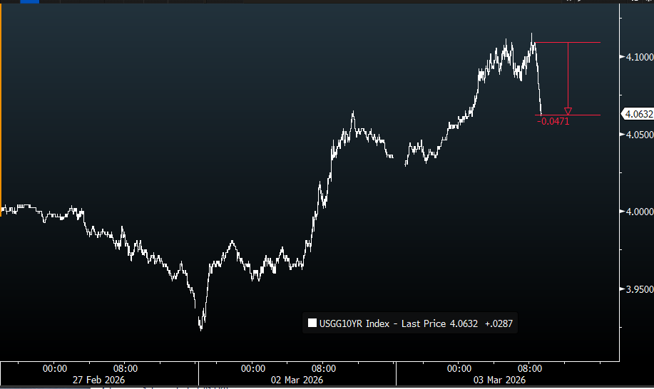 The SPX is now down ~2.5%. As the red annotations show, the 10-year yield is 5 bps lower to 4.06%. Bonds are being bought as crash insurance.