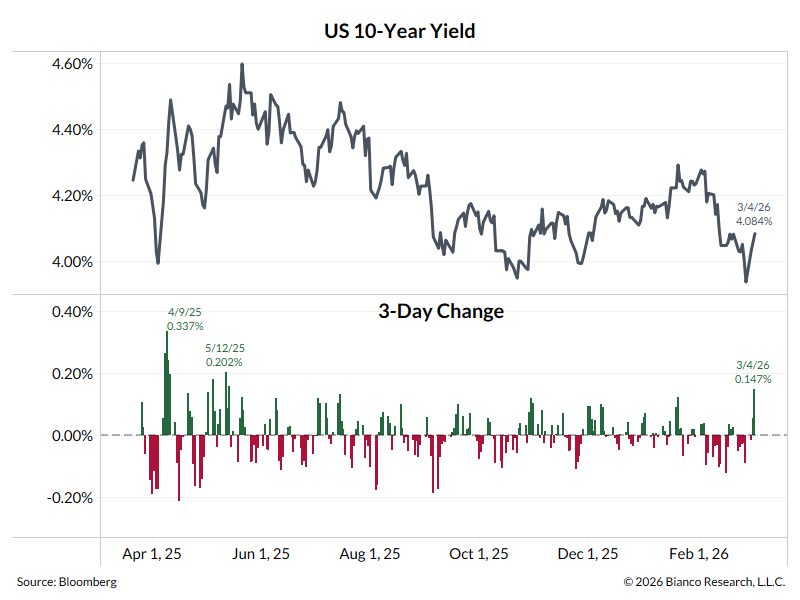 Jim Bianco: The bond market has noticed as the 10-year yield is up 15 bps since Friday’s close. This is the largest such yield rise since May 2025.