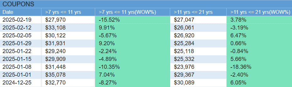 - Dealer positions in > 7 years and< 11yrs Coupons (as of 2/19) were down 5.13bln @27.97bln.