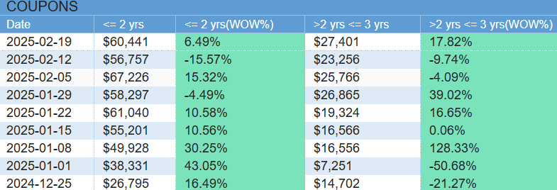 - Dealer positions in < 2yrs Coupons (as of 2/19) were up 3.68bln @60.44bln.