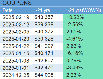 - Dealer positions in > 21 years Coupons (as of 2/19) were up 1.04bln @43.35bln.