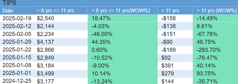 - Dealer positions in 6-11yrs TIPS (as of 2/19) were up 396mln @2.54mln.
