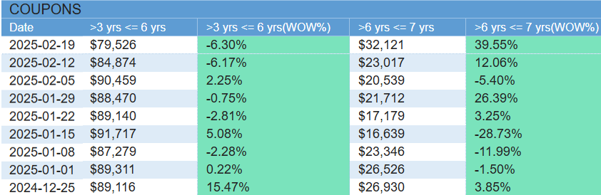 - Dealer positions > 6yrs and < 7yrs Coupons (as of 2/19) were down 9.10bln @32.12bln.