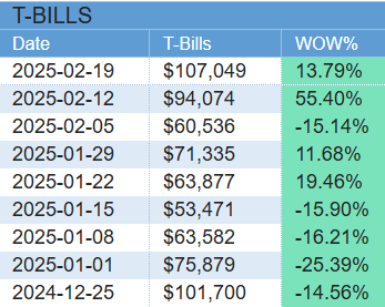 - Dealer positions in T-Bills (as of 2/19) were up 12.97bln @107.05bln