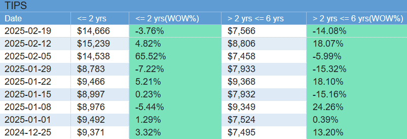 - Dealer positions <2yrs TIPS (as of 2/19) were down 573mln @14.66bln.