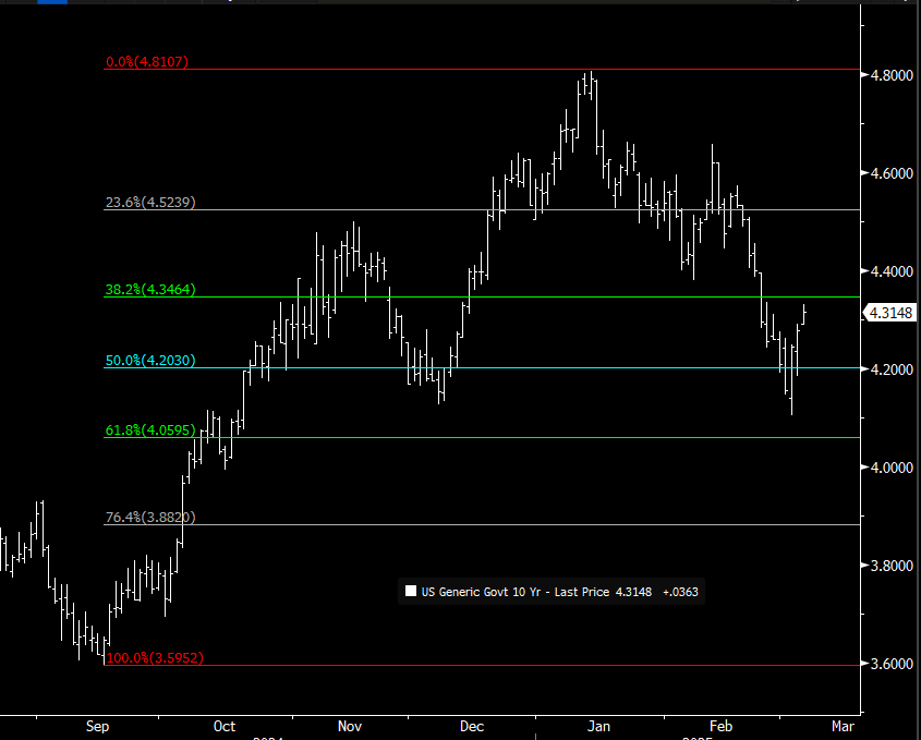 10-year yields dropped to the 50% retracement (cyan line) of the September to January rise.