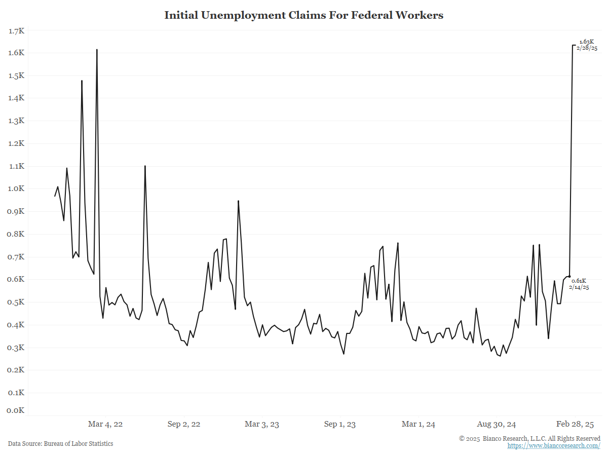 There is a series that aggregates federal workers filing for claims. This has jumped in the week ending Feb 21 (the latest reporting period, week behind overall claims which are the week of February 28).