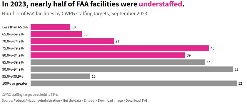 The Federal Aviation Administration (FAA) controls 290 air control facilities. And as of September 2023, nearly half of them were understaffed.