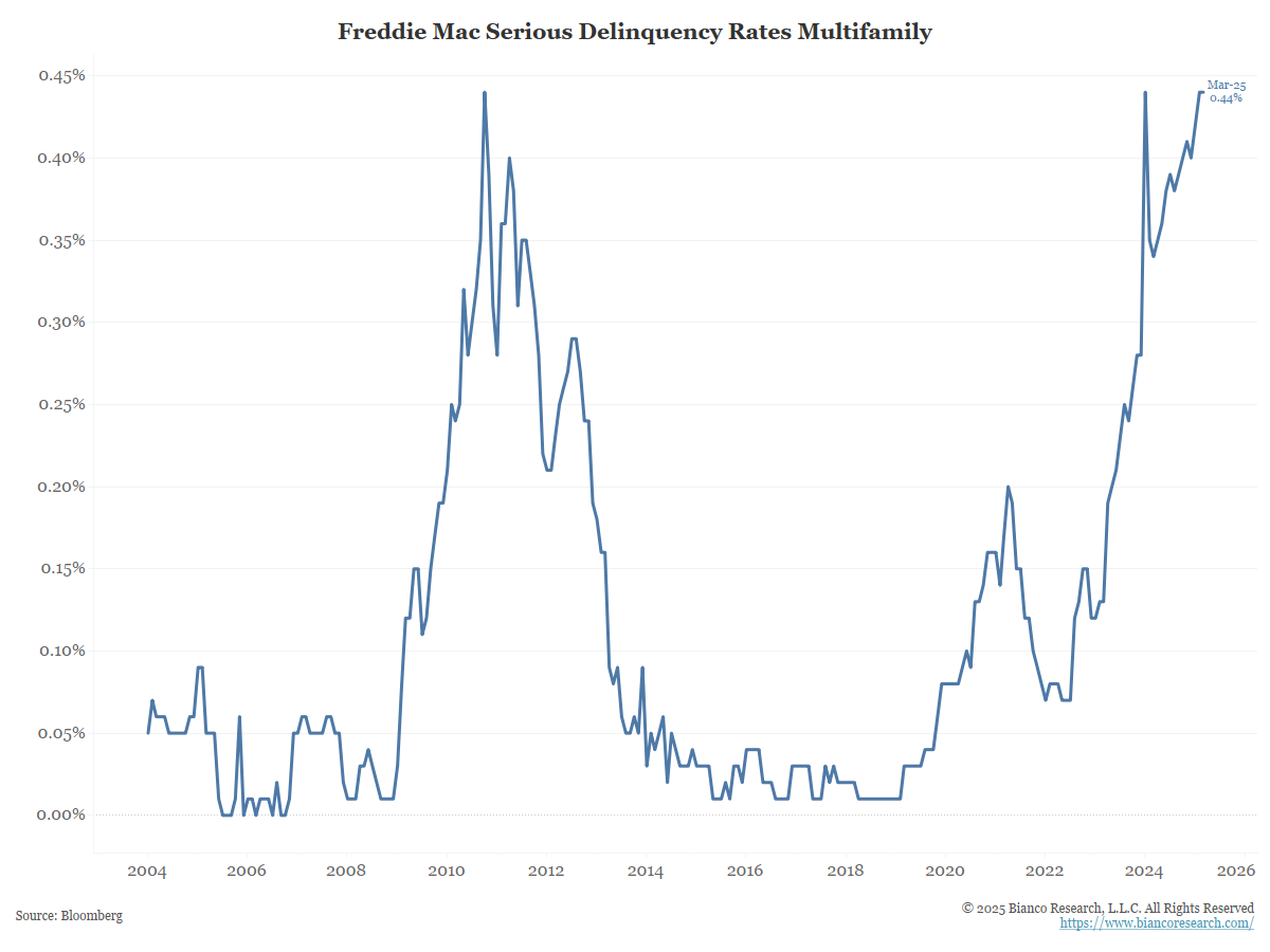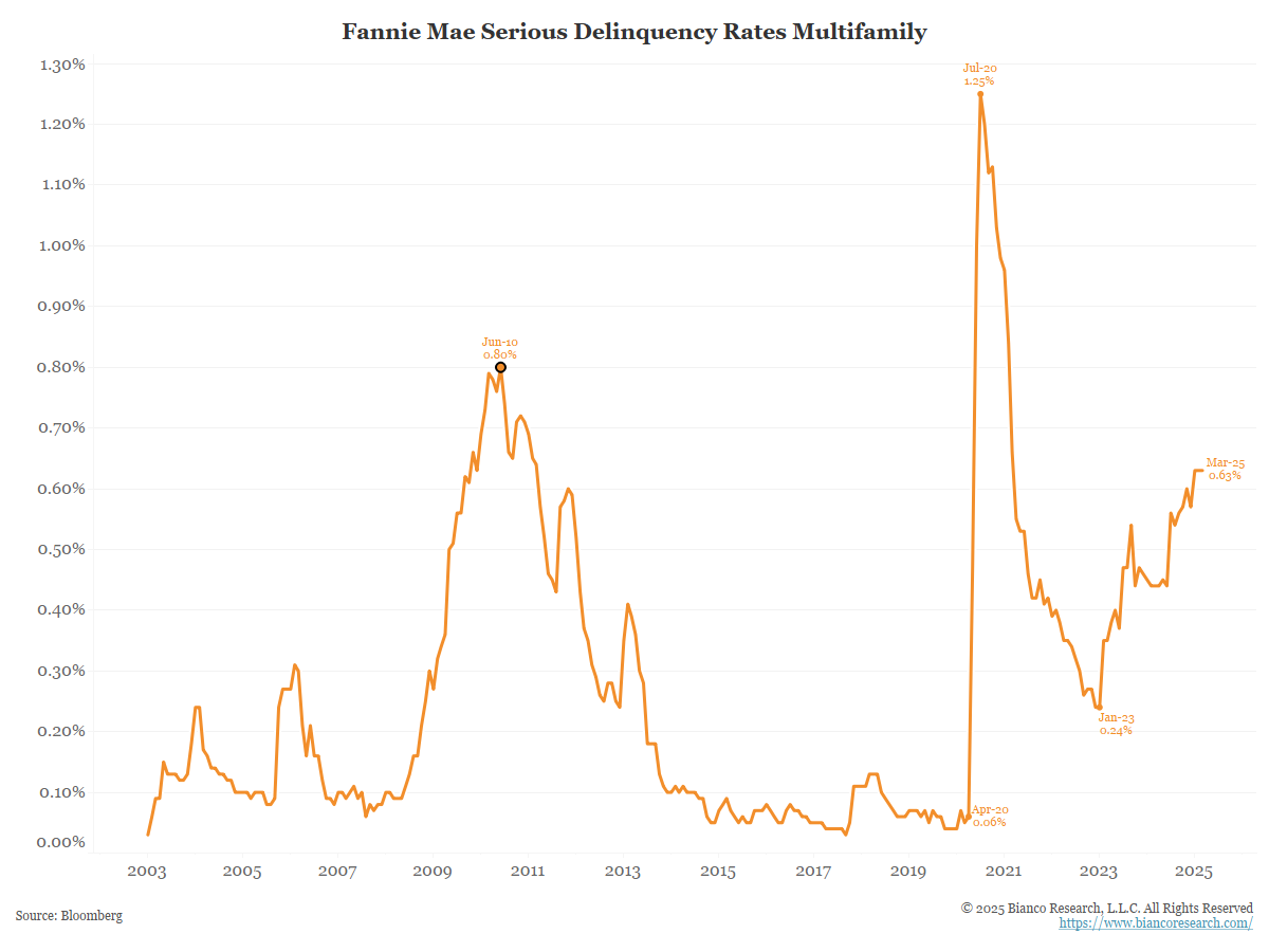 Notably, the rate of multifamily delinquencies currently stands at under 1%, but it is at levels above the 2008 recession. However, there is a big difference between apartment lending and homeowners who have a 30-year fixed-rate mortgage.