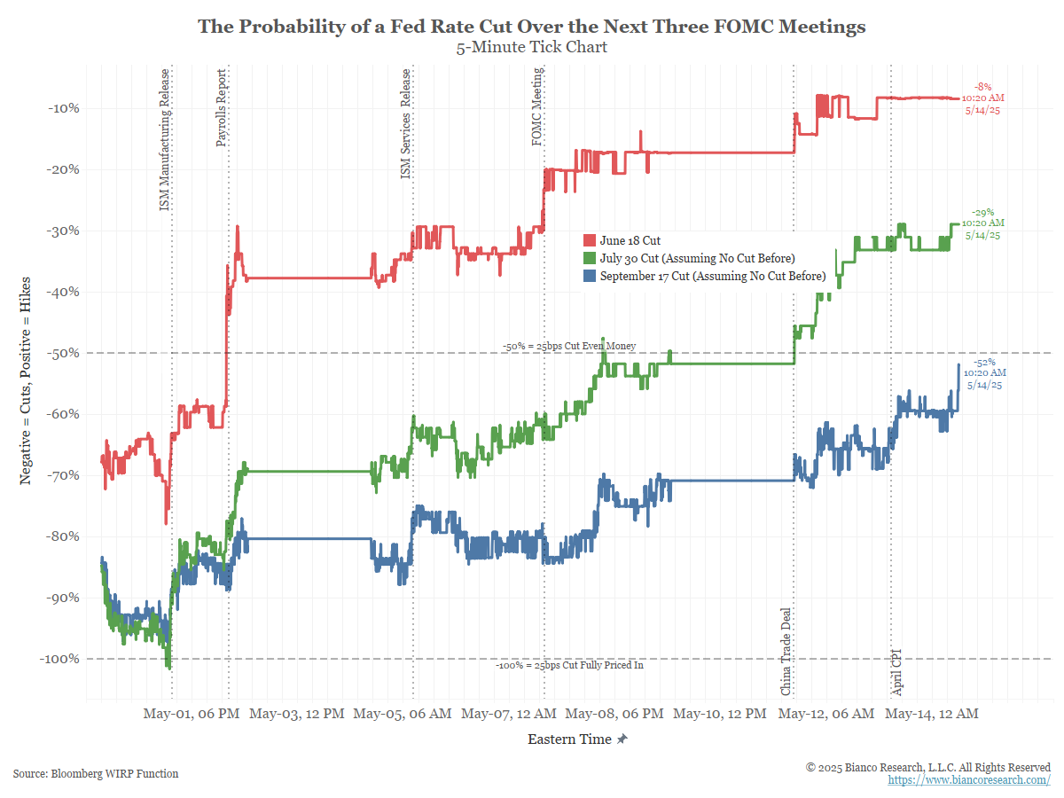 June 18 Fed cut (red) was priced out (less than 50%) on May 2nd. Payroll report. The July 30 Fed cut (green) was priced out (less than 50%) on Monday, May 12. China trade deal.