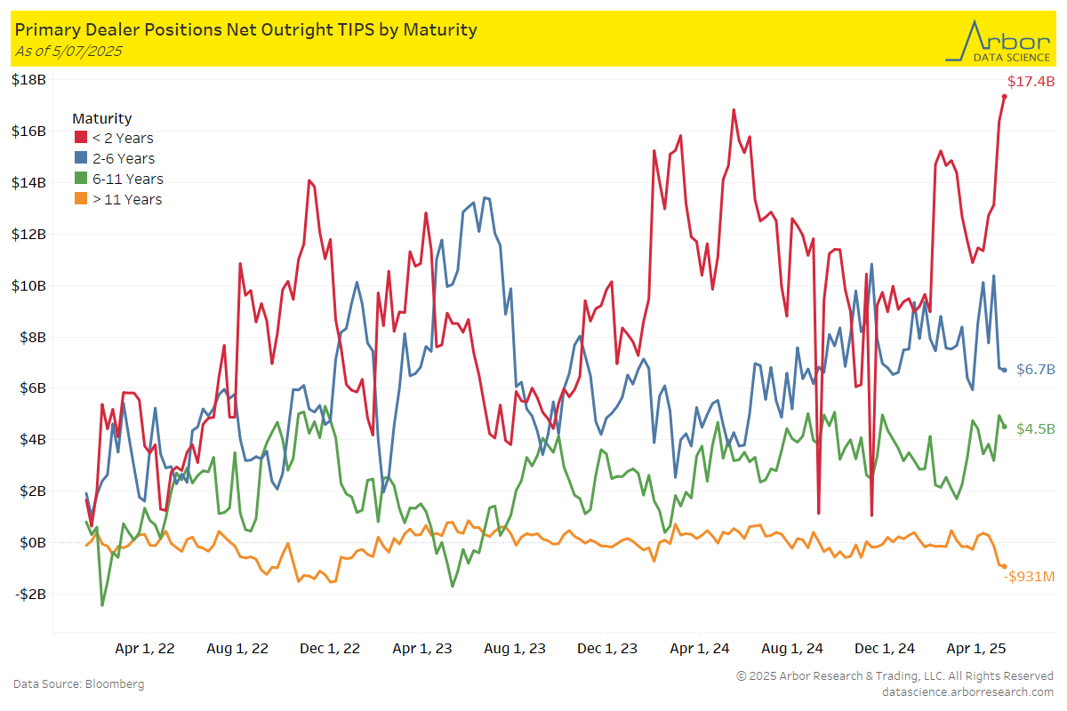 - 6 – 11 years: $4.9 Bn on 4/30/25 to $4.5 Bn on 5/07/25 = ($0.4 Bn)