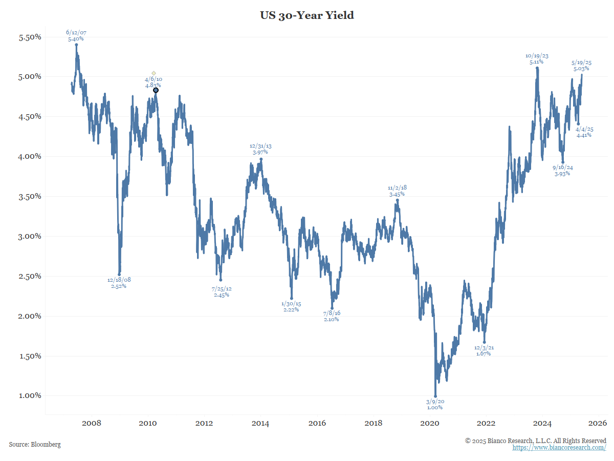 The 30-year yield is now 5.03%—highest since October 2023.