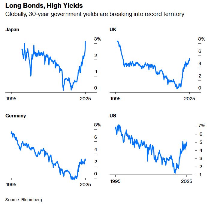 Pain at the Long End: The infamous bond vigilantes are starting to inflict some real pain, and they’re not coming for just the US. The suffering for holders of the longest-dated bonds is global, and the market’s informal enforcers have brought enough rope to ensnare them all.
