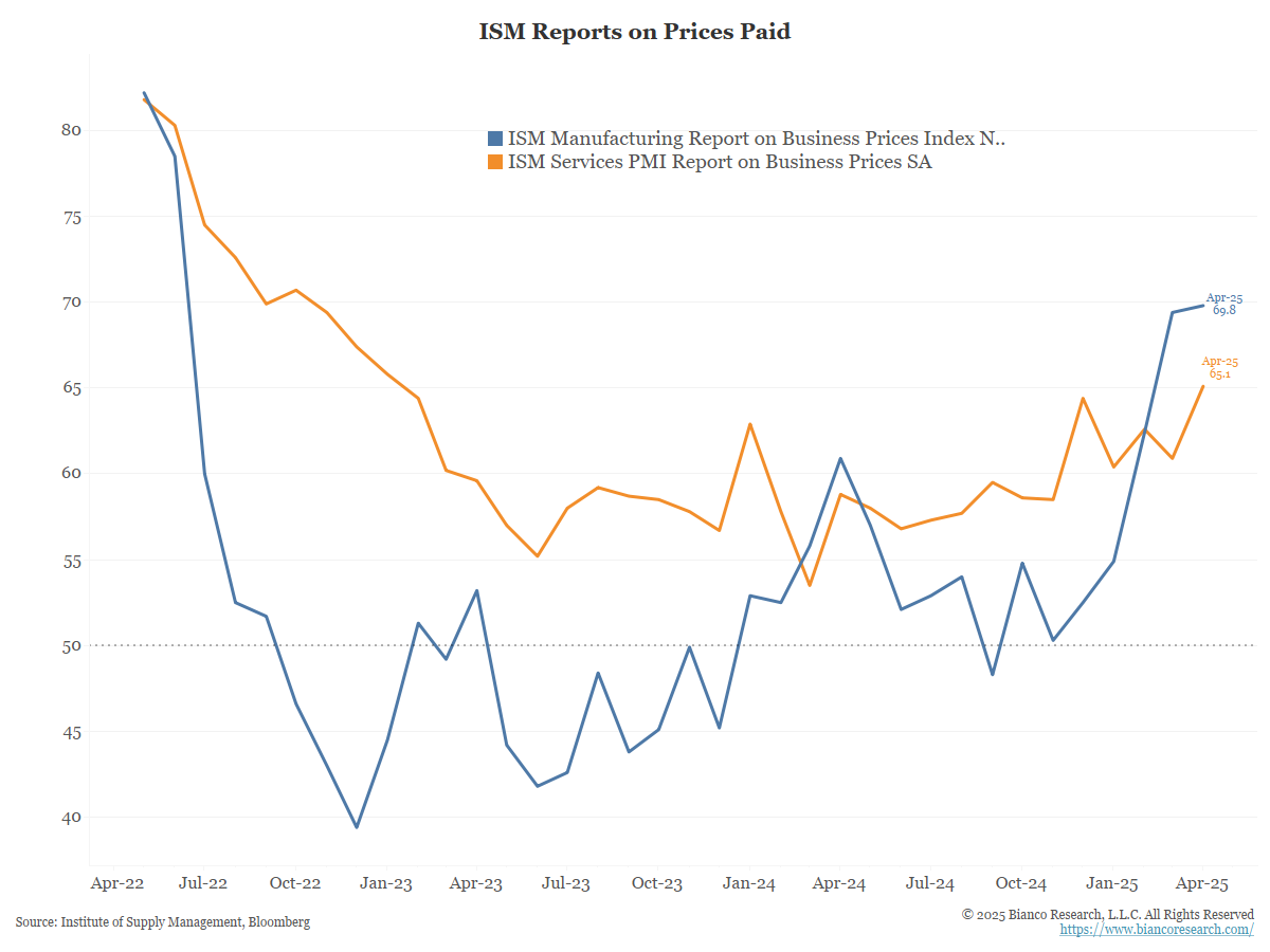 Here are both ISM prices paid measures. Services in orange, also shown above, and manufacturing in blue.