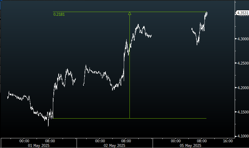 - Monday’s range for UST 10y: 4.285% – 4.37%, closing at 4.34%