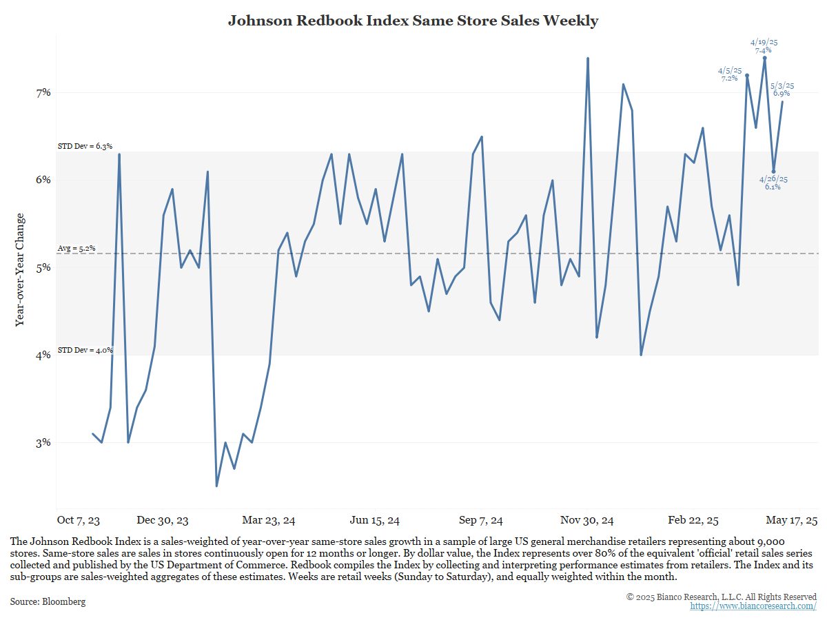 Johnson Redbook measures same-store sales weekly. Chart is current through last week: May 2nd.