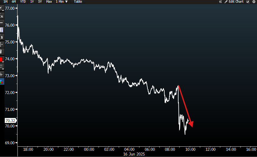 1-day tick chart of crude oil.Now down almost 4% on the day