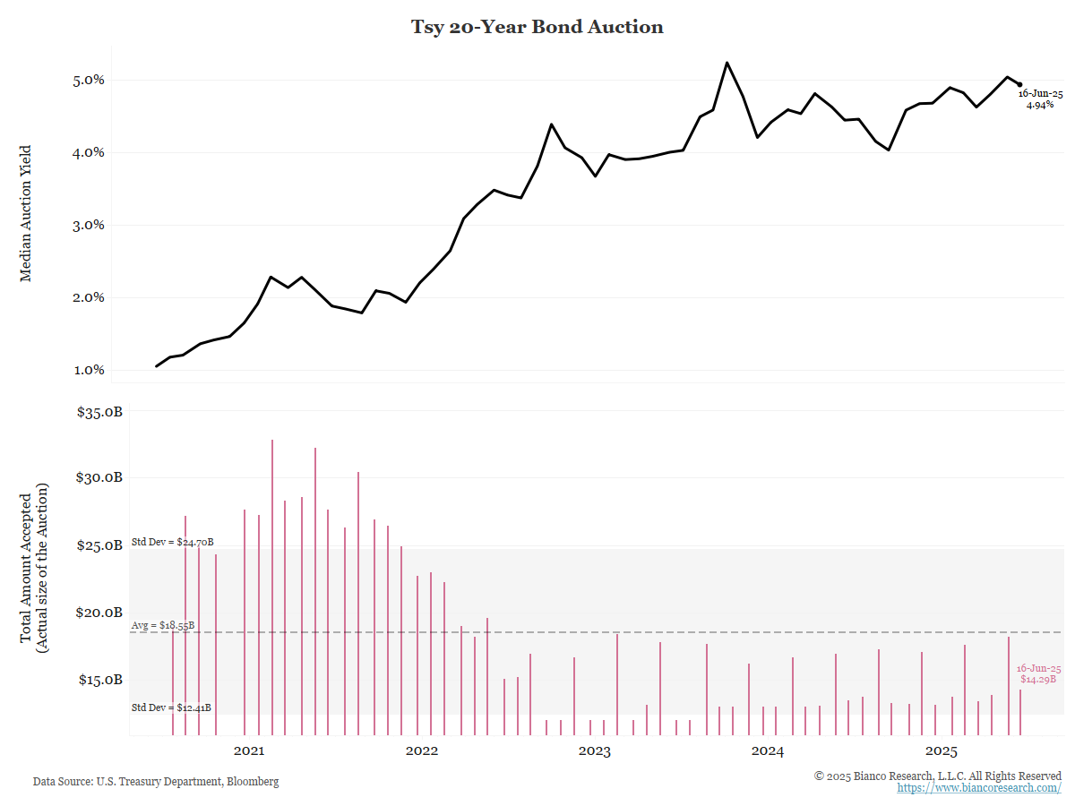I would grade it B-. Remember that last month’s poor 20-year was kicked off talk about who’s going to buy bonds. Are foreigners abandoning the US Treasury market? Then we had wave after wave of decent auctions. And now we had an okay to slightly above-average 20-year auction.
