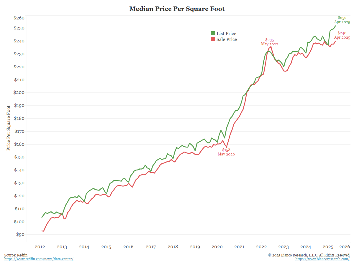 This is my favorite metric of home prices, because it adjusts for the size of the house.