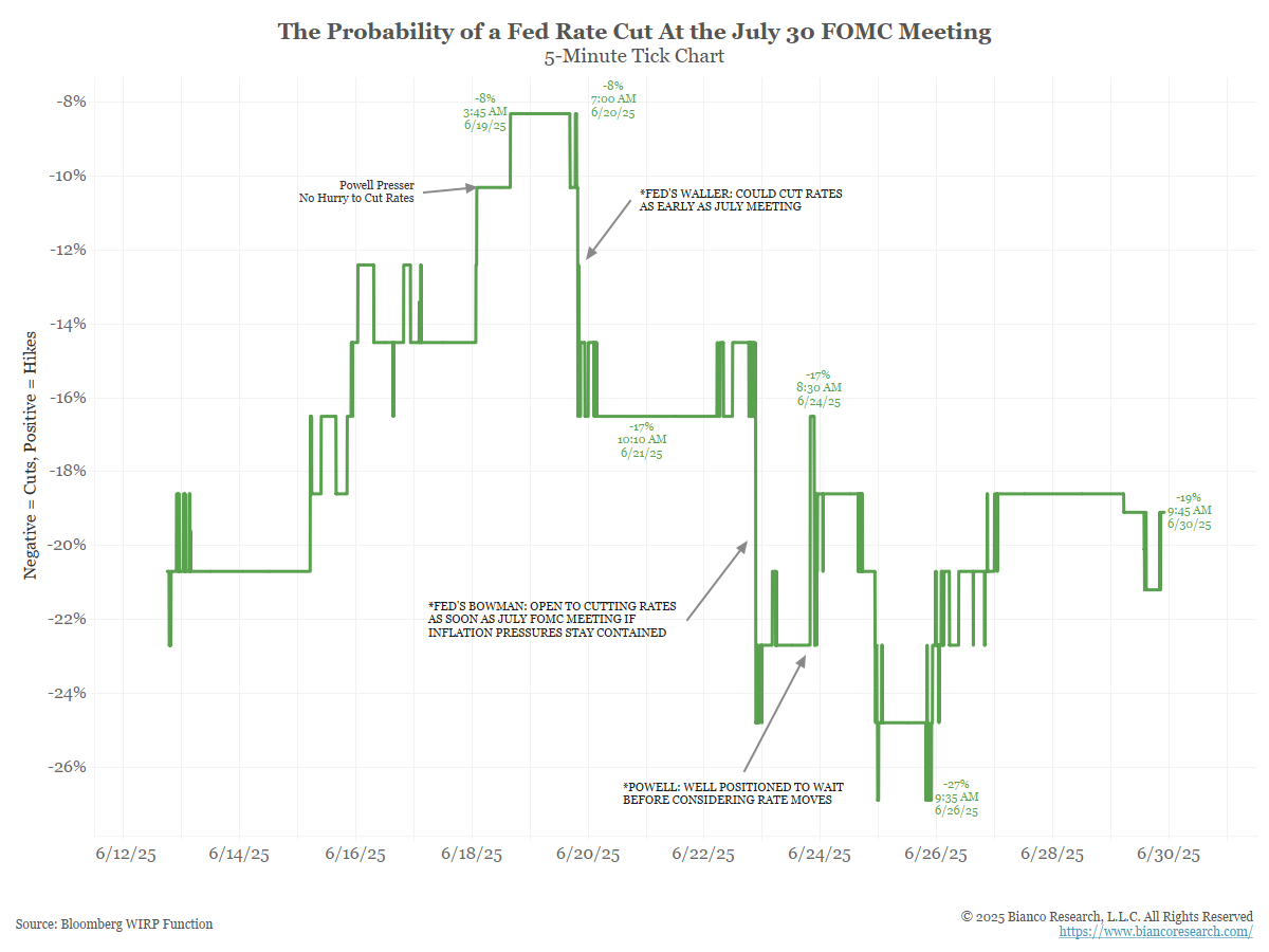 Trump thinks the current 4.25% – 4.5% fund rate should NOW be below 1%. He does not care that the market is assigning a 19% probability of a rate cut on July 30, or an 81% probability of no move (chart). Trump thinks this is an egregious mistake, which is why he called Powell a “very stupid person” yesterday as well.