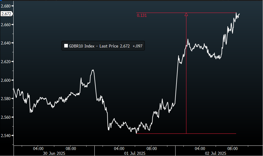 3-day tick chart of the 10-Year Bund Yield. Annotation (red): This yield is up ~13 bps in the last 24 hours.
