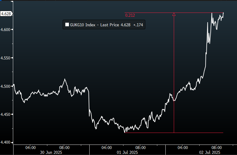 To illustrate how all developed country sovereign bonds tend to move in tandem…3-day tick chart of the 10-year UK Gilt. Annotation (red): This yield is up ~21 bps in the last 24 hours.