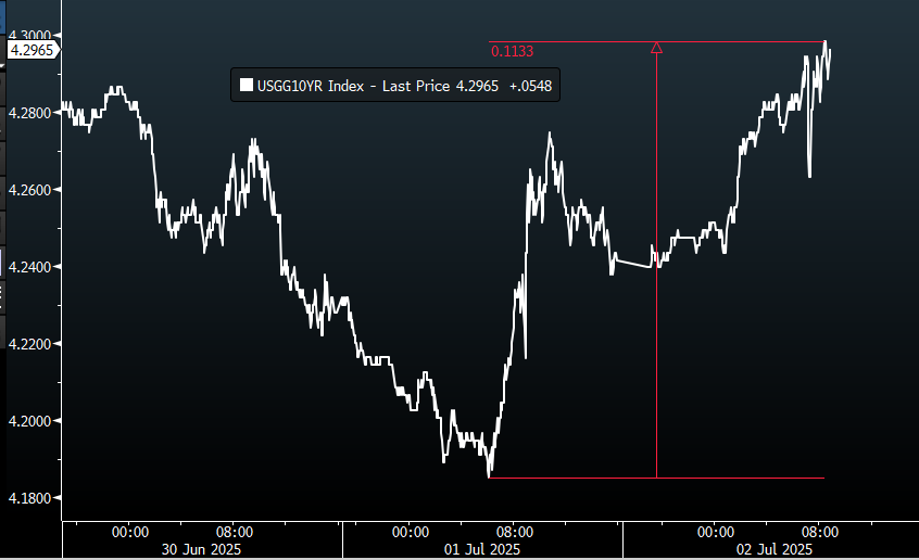 3-day tick chart of the 10-Year US Yield. Annotation (red): This yield is up ~11 bps in the last 24 hours.
