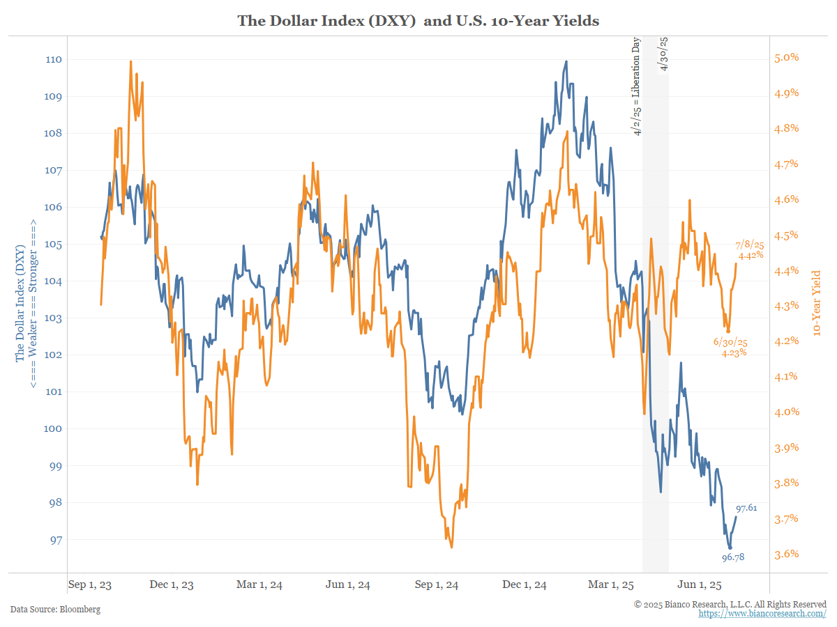 This relationship broke down on Liberation Day (April 2), but appears to have reconnected around April 30. In other words, it stopped working during the shaded area, where the dollar fell, and then reconnected with the dollar at a lower level.