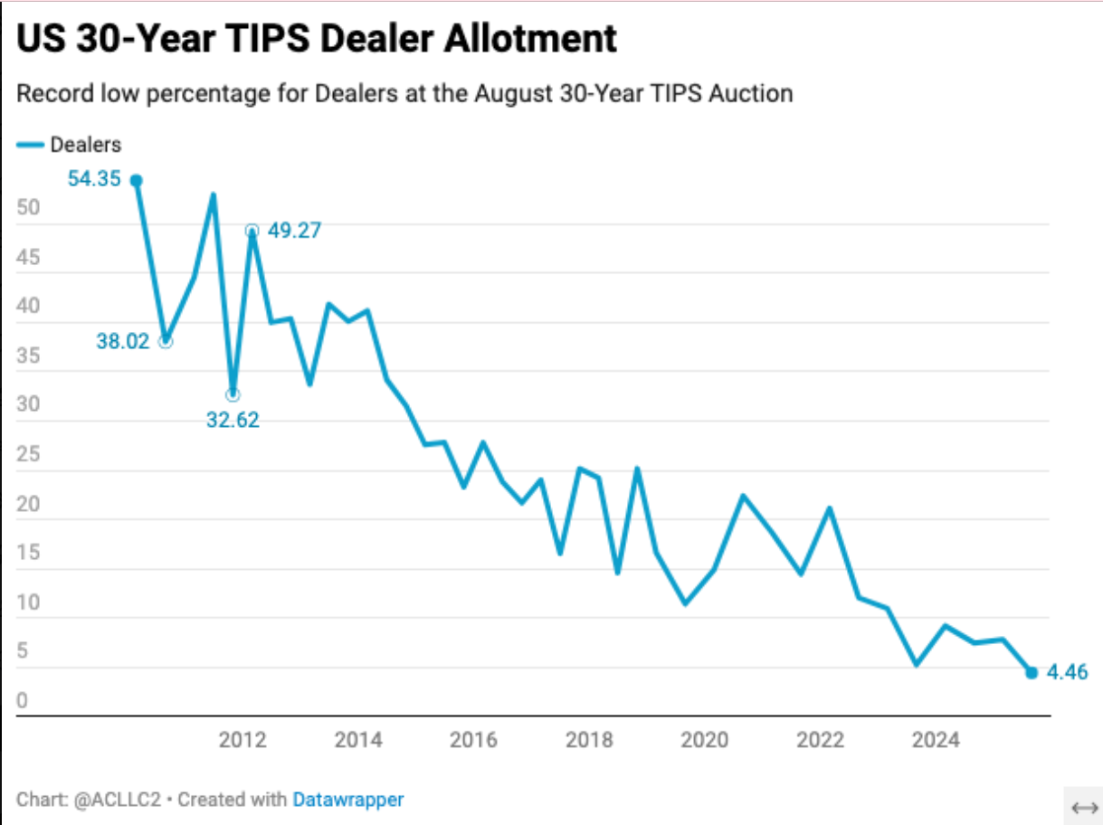 The 30-year TIPS traded through (negative tail) by 2.3bps. Bid-2-cover chart (above), but this is back to 2010. It was the highest in 8 years, and the second-highest in 13 years.
