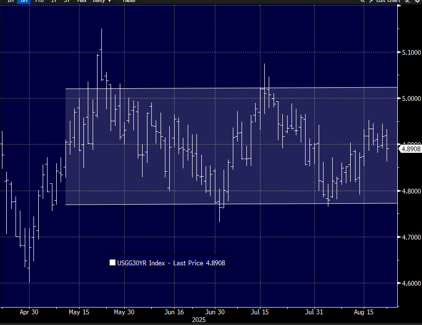 30-year yield with its trend highlighted since early May. It’s dead sideways for months.