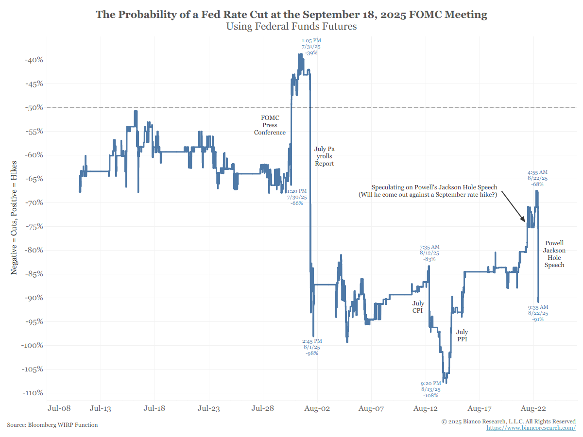 And look at the last bar; today, it’s right in the middle of the range. Long rates are not responding to a Fed rate cut or the slowdown in the labor market that Powell outlined. It’s going sideways.