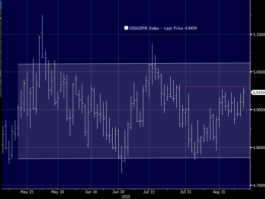 The red line shows the 30-year is now at its highest levels since July 29, the day before the last FOMC meeting. The shaded area shows that the 30-year yield has been confined to a range since mid-May.