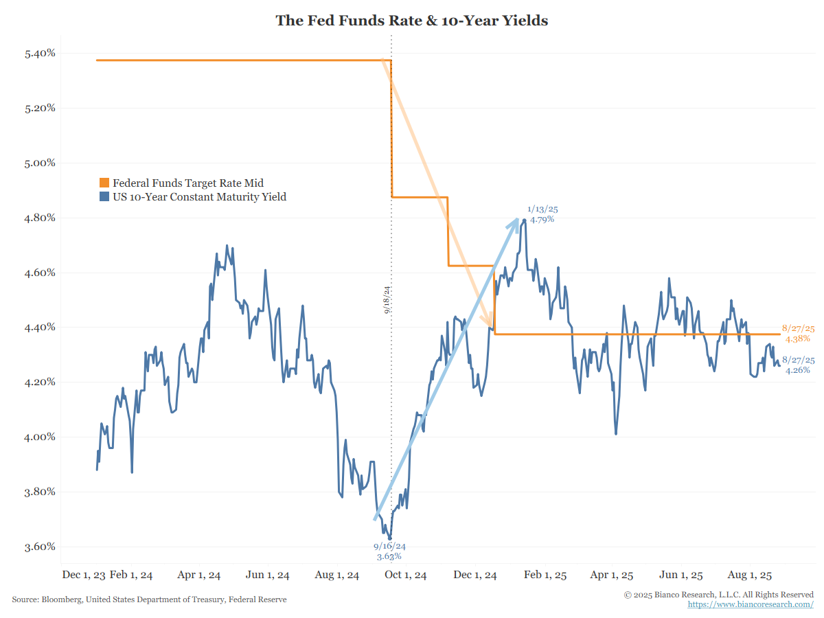 Last year at the Jackson Hole conference, Powell expressed concerns about the state of the labor market, prompting the Fed to cut rates (orange). The 10-year yield responded by rising (blue). The Fed’s concerns about the labor market were misplaced, and the bond market feared that rate cuts would only stimulate and cause more inflation.