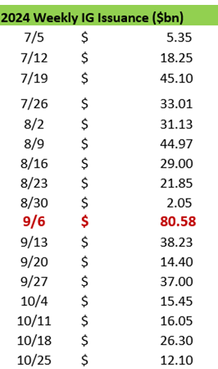 Data picks up tomorrow, but there is growing awareness as well on the anticipated heavy IG issuance next week, typical of the first week post-Labor Day, as shown in the 2024 data below:
