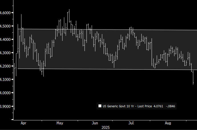 - Friday’s range for UST 10y: 4.06% – 4.165%, closing at 4.08%
